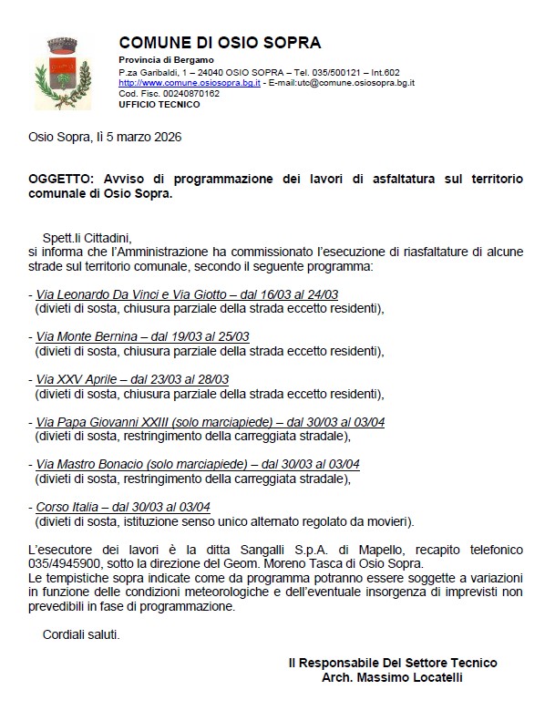 L’esecutore dei lavori è la ditta Sangalli S.p.A. di Mapello, recapito telefonico 035/4945900, sotto la direzione del Geom. Moreno Tasca di Osio Sopra.