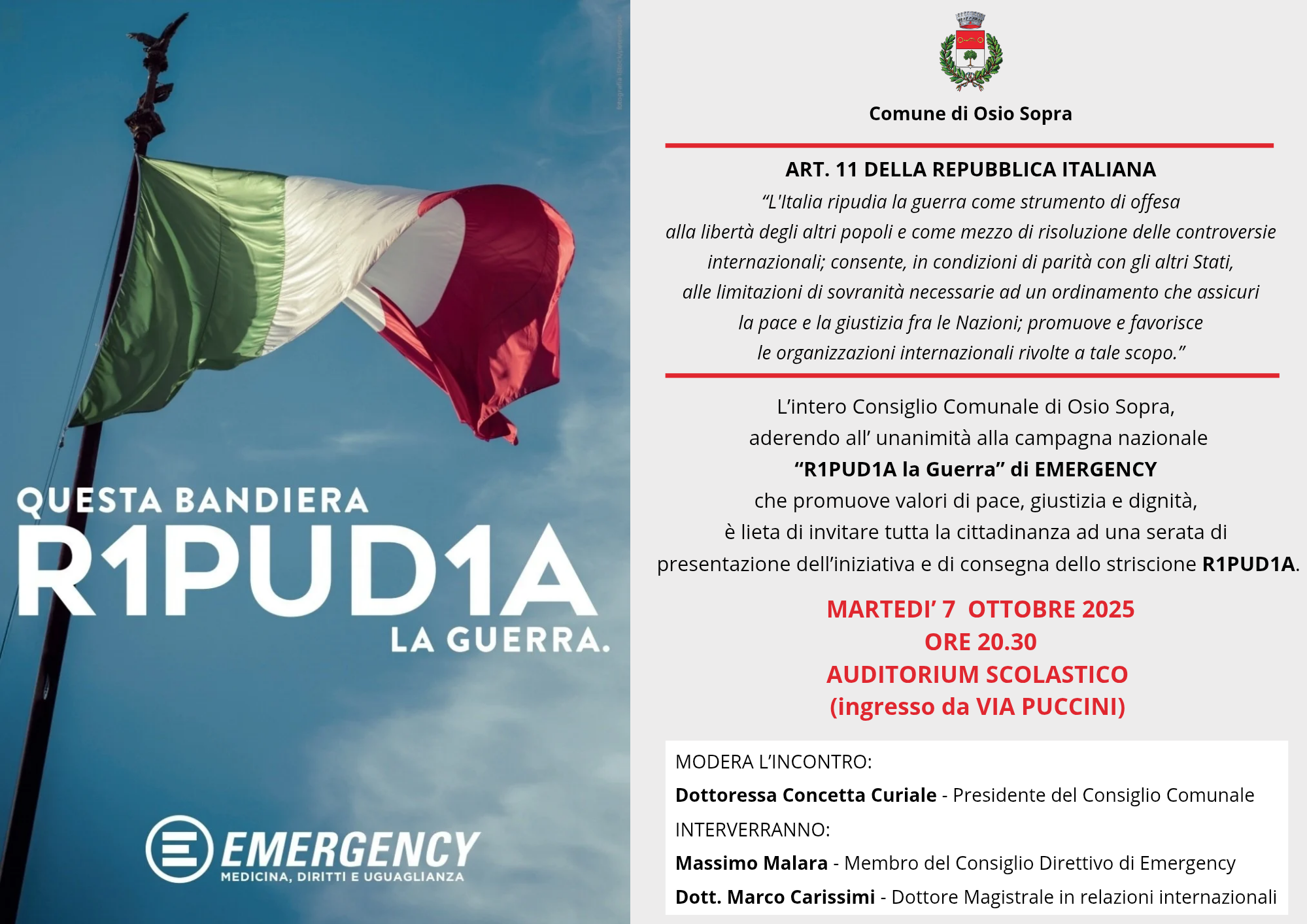 👉Ieri sera il Consiglio Comunale ha deliberato all'unanimità l’adesione del Comune di Osio Sopra alla campagna “R1PUD1A ”, promossa a livello nazionale da EMERGENCY.